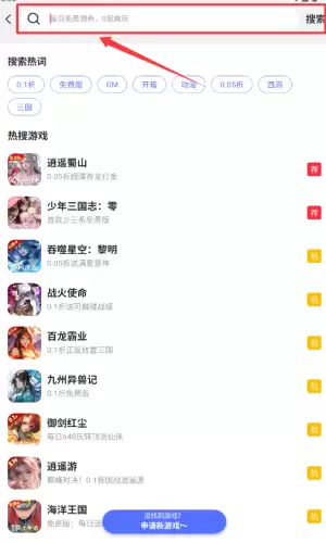 3、您可以在顶部的搜索框内直接输入想要的游戏名称,或通过点击红框区域的热门词条来迅速定位游戏。