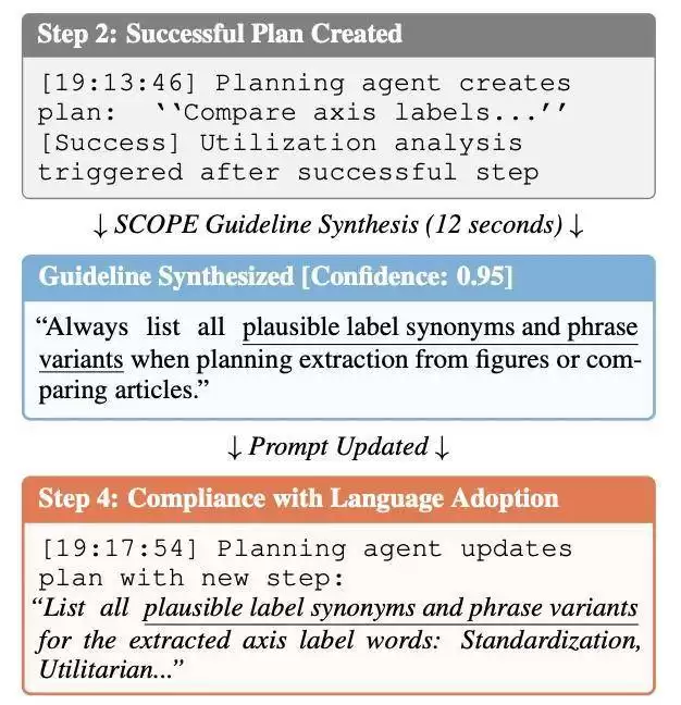 如下图所示,研究团队观察到了 "语言采纳" 现象:当 SCOPE 合成了 "始终列出所有可能的标签同义词和短语变体" 这一规则后,Agent 后续输出中直接引用了相同的措辞。这表明规则被整合到了 Agent 的决策过程中。此外,行为变化通常在规则合成后几秒内就会发生,展示了单个任务内的实时适应能力。