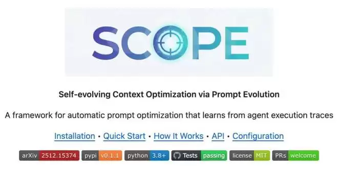 即插即用:只需在 Agent 执行循环中调用 `on_step_complete ()` 接口,即可为现有 Agent 系统添加自我进化能力,无需修改原有架构。模型无关:通过统一的适配器接口支持 OpenAI、Anthropic 以及 100 + 其他模型提供商(via LiteLLM),方便开发者使用自己偏好的模型。轻量部署:核心依赖精简,可通过 `pip install scope-optimizer` 一键安装。