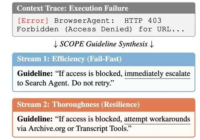 定性分析显示,面对同一个 HTTP 403 访问拒绝错误,效率流学会 “快速失败”—— 立即升级到搜索 Agent,不再重试;而周全流则学会 “寻找替代来源”—— 尝试 Archive.org 或转录工具。这种二元性让 SCOPE 能够同时处理时间紧迫型和深度检索型任务。