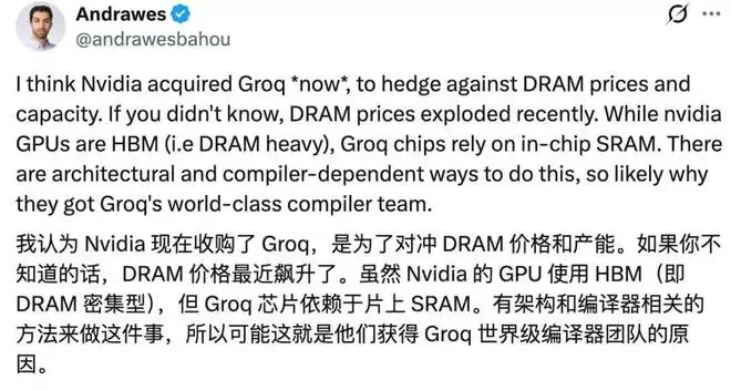 英伟达与 Groq 的交易,是为了对冲 DRAM 的价格疯涨和产能短缺,探索在内存上的新的技术路径。