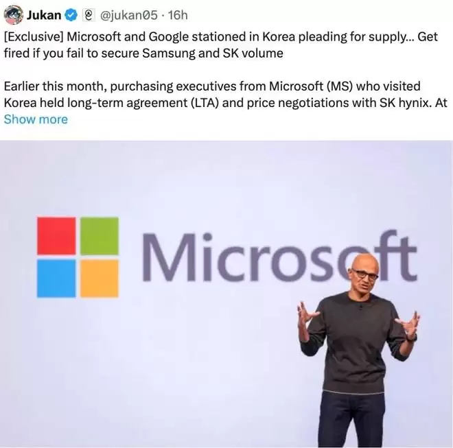 本月初,微软采购高管访问韩国,与 SK 海力士就长期供货协议及价格展开谈判。在会议中,SK 海力士明确表示:「在微软提出的条件下,供货存在困难。」一位半导体业内人士透露:「听到这个答复后,一名微软高管当场情绪失控,愤然离席。」