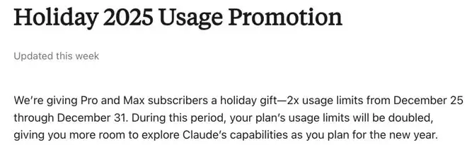 Anthropic正式在「2025年假日使用促销」中提到为Pro和Max订阅用户准备了一份节日礼物: