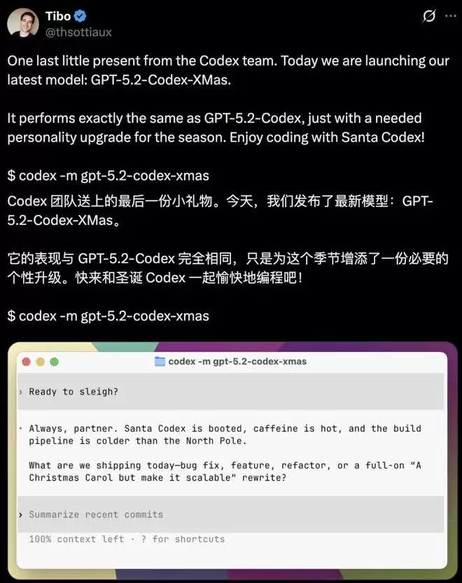 OpenAI的Codex工程主管Thibault Sottiaux表示,这款名为GPT-5.2-Codex-XMas的模型,在功能上与GPT-5.2-Codex完全相同,只是为了圣诞节而增加了一点个性化升级。
