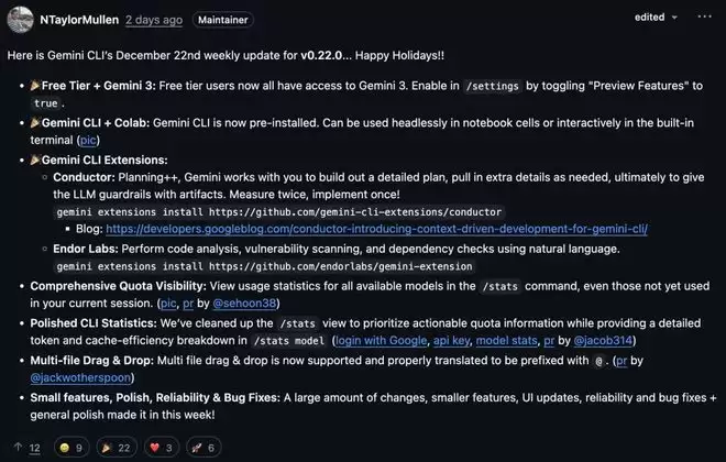 Gemini CLI在12月22日的周更中明确写着「Happy Holidays!!」,宣布免费用户也能用Gemini 3,还在Google One年费中把Gemini 3 Pro和一系列AI工具打包成「半价年货」。