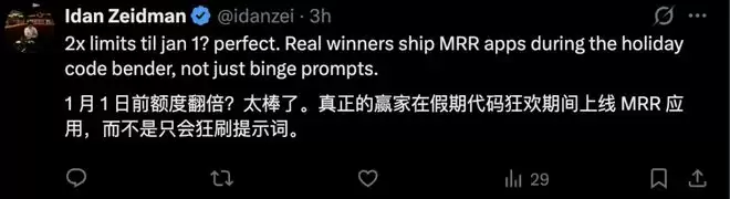 除了推出圣诞版Codex之外,OpenAI准备的节日礼物还包括重置速率限制,并将使用上限提升至平时的2倍,一直到明年1月1日。