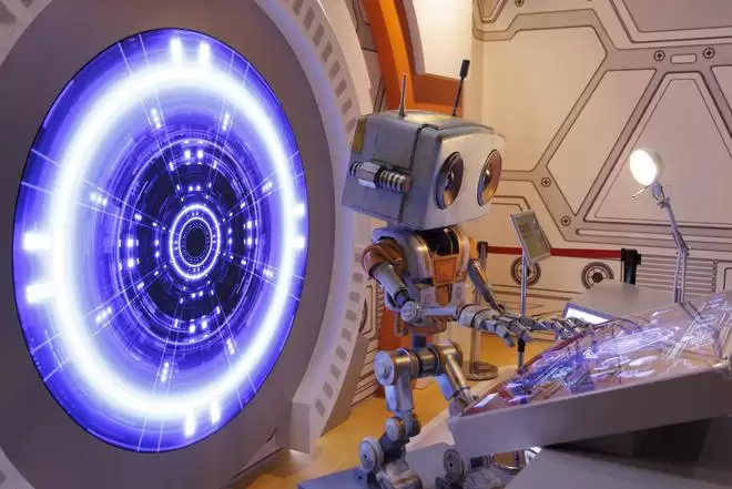 2025年6月28日在中国科学技术馆《Project X:星际友好计划》航天科幻扩展现实(XR)大空间体验展拍摄的人工智能机器人星启8号。
