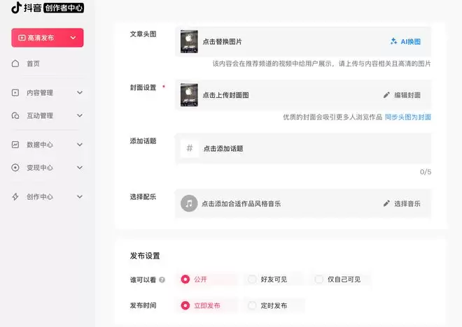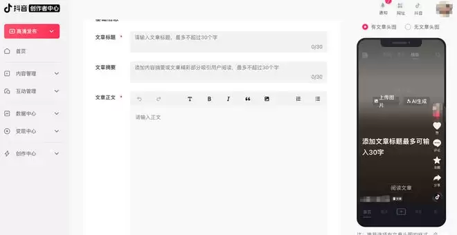 在长图文的后台编辑界面,创作者可以设置标题、摘要、正文、头图以及封面,还可以为内容添加话题标签和背景音乐。
