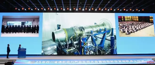 “数控参数一切正常!”“稳态参数正常!”12月26日上午十时许,2025年四川省通航动力产业生态大会暨轻型航空发动机点火仪式现场,随着指令下达,四川天府轻型动力科技有限公司(以下简称“天府轻动”)试车台上F918涡扇发动机的轰鸣声响彻会场。
