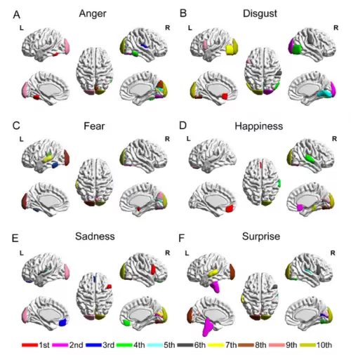 六种基本情绪下排名前10个脑区的分布情况
