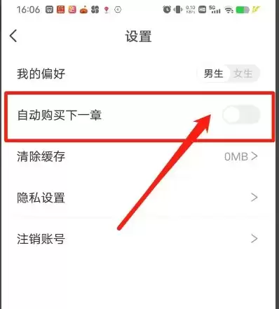 进入设置页面后,找到并点击“关闭自动购买下一章”按钮即可完成设置。
