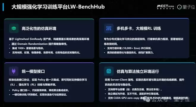 第二个应用是大规模RL系统平台LW-BenchHub,可以在高仿真环境中开展大规模RL训练,同时运行成千上万的并行仿真实例。