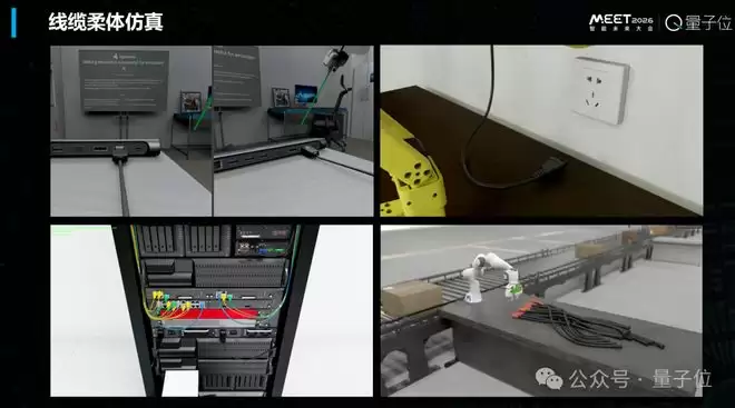 这是线缆,线缆是一个圣杯级的难题,可以看到曲度变化插拔接口的效果,不同力度都能实现准确的仿真,这帮我们赢得很多工业级客户,刚才提及的进入场景的客户,很多也都看到了我们在线缆上的一个重要突破。