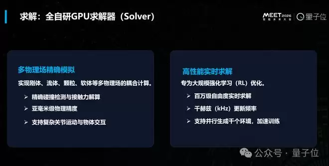 我们的Solver是全栈自研的GPU Solver,可以支持百万级自由度的求解,实现刚体、流体、球体多物理场的耦合,物理精度达到亚毫米级,更新频率达到千赫兹。