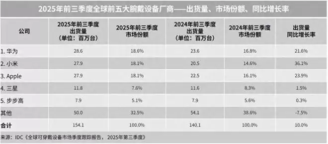 市场的结构性变化同样显著。手环品类展现出更强的增长弹性,而智能手表则在更高价位段进行着功能创新竞赛。IDC前三季度累计数据显示,华为凭借其在健康监测技术的持续投入与海外市场拓展,腕戴设备累计出货量位居全球第一。小米以2790万台的出货量,成为全球前五大厂商中增长最快的品牌。苹果、三星、步步高(旗下小天才)分列其后,共同构成了当前市场的核心阵营。