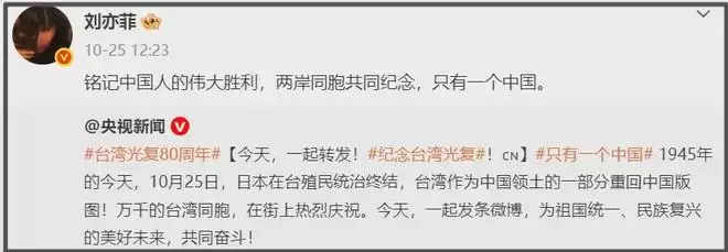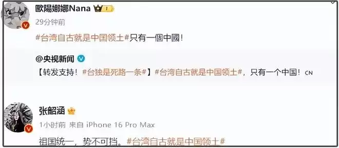 像欧阳娜娜、张韶涵等人,她们都会带上“台湾自古就是中国领土”等话题转发,强调祖国统一势不可挡,明确表示只有一个中国,而吴慷仁转了一个十一国庆微博,都绝口不提祖国,而是说了一句“祝福锦绣中华”。
