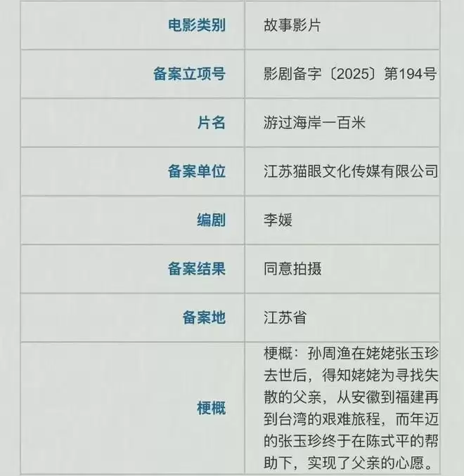 备案显示,章子怡自导自演的新片《游过海岸一百米》讲述的是“姥姥”张玉珍寻找失散父亲的故事,从安徽到福建再到台湾,“姥姥”历经艰辛,终于实现了父亲的心愿。