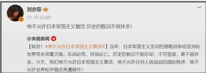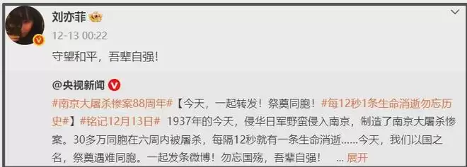 美籍华裔女星刘亦菲时常被吐槽转发表态不积极,但她近期转发一次没落,从铭记12月13日,守望和平,吾辈自强到历史教训不容抹杀,再到铭记中国人的伟大胜利,只有一个中国,明面上的态度还是很清晰的。