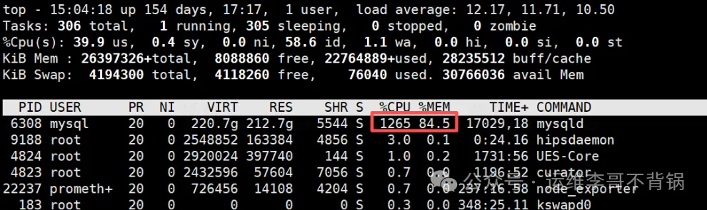 1265% ≈ 12.6 个核心被 mysqld 占用,并未达到上限。