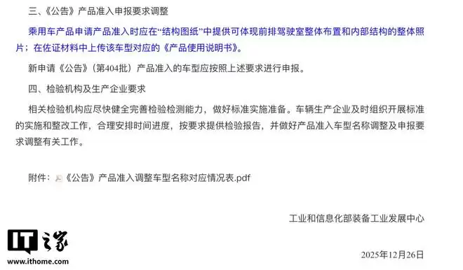 不过,根据工业和信息化部装备工业发展中心今日发布的《关于〈公告〉标准实施及产品准入相关要求调整的通知》,从明年第404期《道路机动车辆生产企业及产品公告》新产品公示列表开始,乘用车产品在申请准入时,应在“结构图纸”中提供能体现前排驾驶室整体布置和内部结构的整体照片,并在佐证材料中上传该车型对应的《产品使用说明书》。
