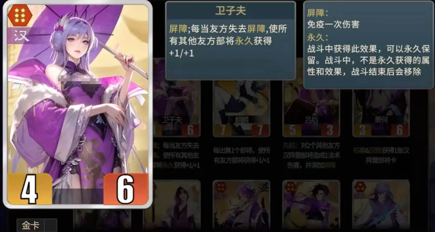 “屏障”是汉阵营的特性效果,而卫子夫的技能能在友方部将失去屏障时,立刻让所有其他友方部将获得永久的“+1/-1”属性增益。配合能为自身或友方套上屏障的角色,可以让她在对战中多次触发技能,为汉阵营的部将快速叠加战力。因此,她自然成为了汉阵营不可或缺的核心。
