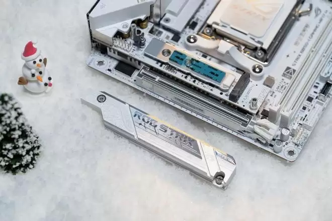 内存方面,ROG B850迷你吹雪配备2条DDR5内存插槽,纯白配色为整机颜值加分不少。在搭配锐龙8000G系列处理器时最高可支持9600+MT/s,搭配锐龙9000系列时则为8200+MT/s,这一规格对于大多数玩家而言完全够用,且考虑到当前内存价格与 AMD平台高频内存的实际收益,该频率表现堪称均衡。