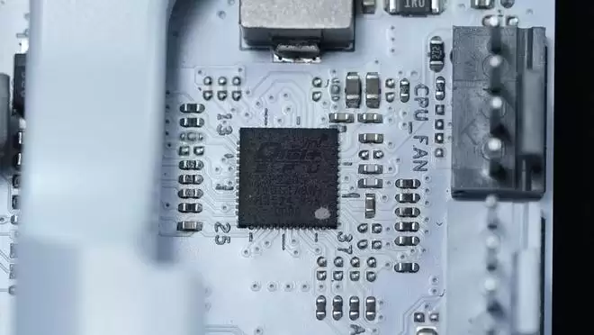 主板配备了厚实的VRM散热装甲,装饰面板采用了全新设计语言,风格更契合纯白主题,不过遗憾的是依旧没有配备 RGB 灯光。散热装甲中间内置一颗4cm小风扇,通过主动散热方式有效缓解 VRM 区域的散热压力,确保高负载下的稳定性,这一设计在ITX主板中还是非常实用的。