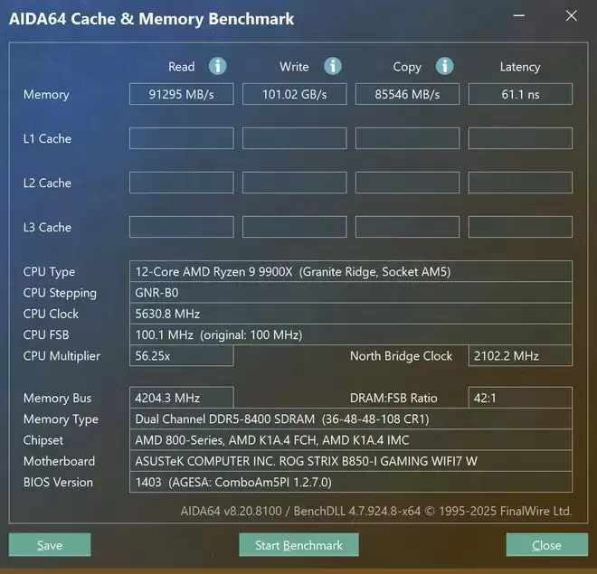 ITX主板只有2条内存插槽,且布线距离更近,天生就有更好的内存超频性能。所以我们也对ROG B850迷你吹雪进行了内存超频实测。在搭配锐龙9000系列处理器时,主板最新标称可以支持8200+MT/s。