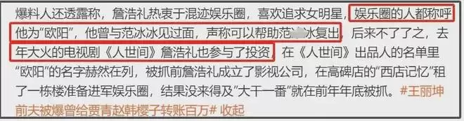 詹浩礼跟娱乐圈牵扯很深,投资过大爆剧《人世间》,和贾青交往,还被曝给赵樱子转了120万。当然,后来赵樱子否认了。而受害者还曝出了很多细节,包括詹浩礼与王丽坤结婚之后,照样出去嫖娼,对象都是演艺圈的小明星,直接有一份名单,都调查出来了。