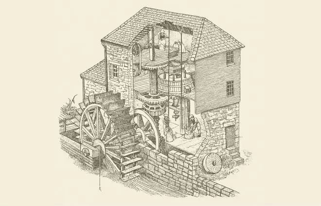 第二个故事是关于蒸汽机的。在工业革命初期,早期的纺织厂坐落在河流和溪流旁边,靠水车驱动。当蒸汽机问世时,工厂主最初只是把水车换成了蒸汽机,其他一切照旧。生产力的提升很有限。