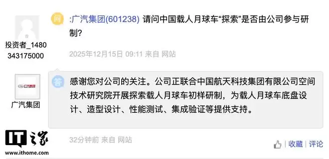 12月26日,据IT之家报道,广汽集团当晚通过互动平台宣布,公司正与中国航天科技集团有限公司空间技术研究院(又称“中国空间技术研究院”或“航天五院”)展开合作,共同探索载人月球车初样研制工作。广汽将为载人月球车的底盘设计、造型设计、性能测试、集成验证等环节提供技术支持。