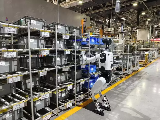 图为具身天工2.0在福田康明斯工厂搬运料箱