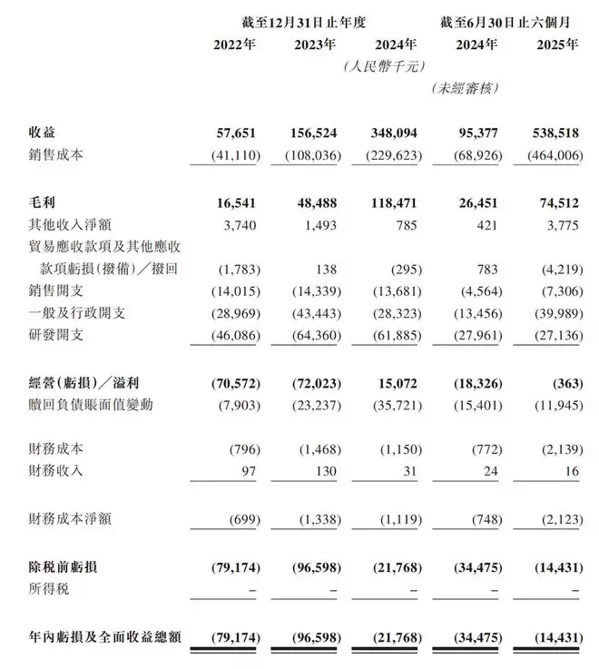 根据其招股书,营收方面,该公司最近三年来营收规模迅速扩大,从2024年的5765.1万元,飙升至2024年的3.48亿元,2025年上半年,其营收进一步跃升至5.39亿元,同比增幅达464.6%。