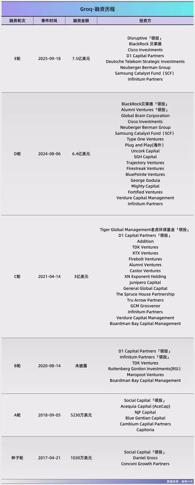 Groq创始人Jonathan Ross曾任谷歌张量处理单元的核心设计师,在2016年成立了Groq。成立以来备受资本追捧,曾获得红杉资本(美国)、贝莱德、老虎环球基金等机构的投资。最新一轮投资发生在2025年9月,获得Disruptive、贝莱德等机构的7.5亿美元投资,投后估值69亿美元。