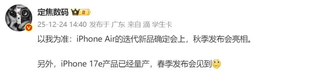 尽管初代产品市场表现不佳,但有博主近期透露苹果并未放弃Air系列,iPhone Air2仍计划在明年秋季如期亮相。