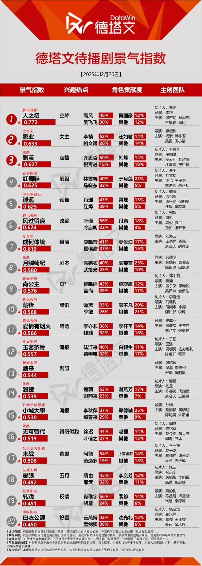 德塔文电视剧景气日报2026-01-16电视剧当日景气TOP20TOP20排名玉茗茶骨(陆江来48% 荣善宝41%) 轧戏(胡羞39% 肖稚宇25%) 剥茧(齐思哲40% 祝青越21%