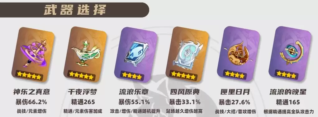 武器方面,优先推荐选择「神乐之真意」或「千夜浮梦」;其次可以考虑「流浪乐章」、「四风原典」和「天空之卷」这类通用输出型武器。如果采用站场玩法,则可以选用「匣里日月」来持续触发武器技能效果。