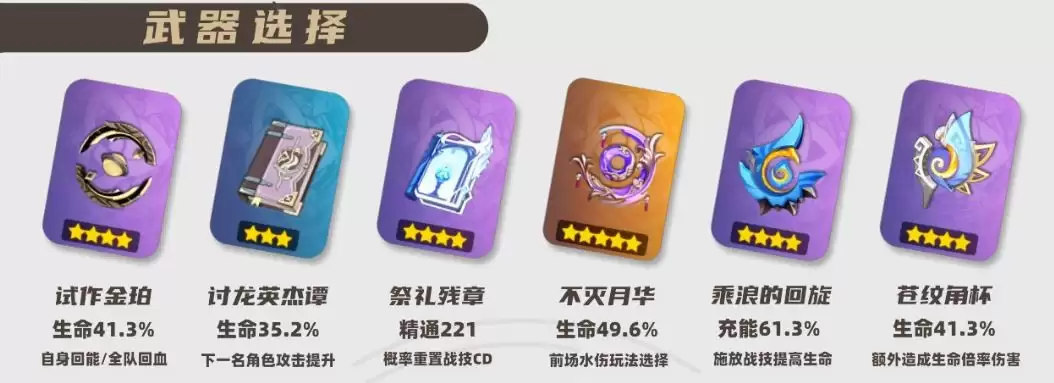 第二种是站场水伤玩法。该玩法推荐将三个技能全部升级,主要搭配生命值属性的法器,如「不灭月华」、「碧落之珑」、「试作金珀」等。心海在此类队伍中通常作为水伤输出核心,常见的队伍有心芙万夜(心海、芙宁娜、万叶、夜兰)等。