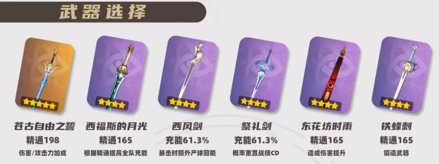 武器选择上,优先考虑能够提供精通或充能加成的类型——精通类武器包括「苍古自由之誓」、「西福斯的月光」、「东花坊时雨」、「铁蜂刺」、「暗铁剑」等;充能类武器则主要有「西风剑」、「祭礼剑」等选项。