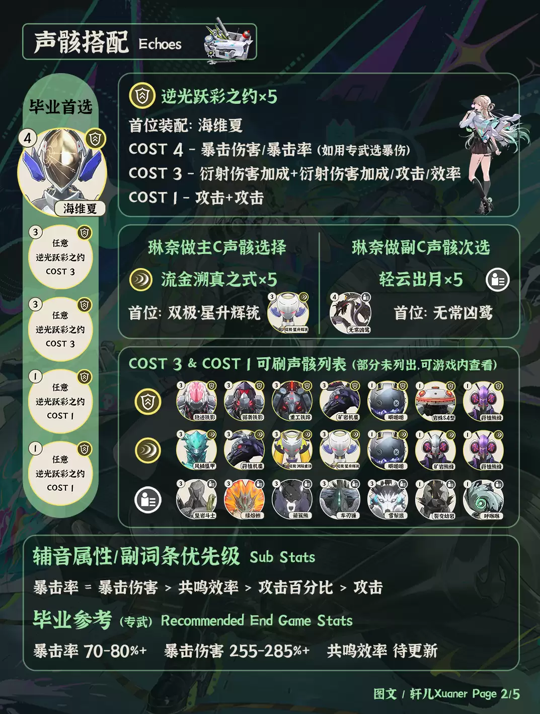 ② 琳妮声骸套装推荐优先逆光跃彩之约五件套,这是作为副C的优质选择,能为下一位角色提供攻击力加成。首位装配COST4海维夏,可以给下一位角色提供全属性伤害加成。如果打算抽高链拿来当主C使用,声骸套装要用流金溯真之式五件套,提供自身衍射伤害提升和普攻伤害加成。注意做主C首位要装配COST3双极·星升辉铗,提供衍射和普攻伤害加成。如果只是0+0当个纯辅助,不输出,培养精力不够,可先用轻云出月五件套替代。