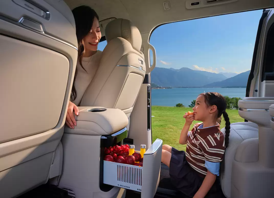 1334mm的同级最大车内高度,搭配200mm宽的二排中央通道,为家庭成员活动提供便利。10岁以下儿童可在车内自由站立、穿行,二排乘客无需起身即可照料三排儿童,有效降低长途出行的照看压力。配置层面,二、三排座椅均配备加热、通风、记忆及SPA级按摩功能,且支持躺倒调节,长途驾乘可实现如居家般的放松体验。超宽温域冷暖箱可在-6℃至50℃精准控温,满足四季饮品存储需求;二排双小桌板兼具办公、零食分享与学习功能,贴合多孩家庭场景需求。