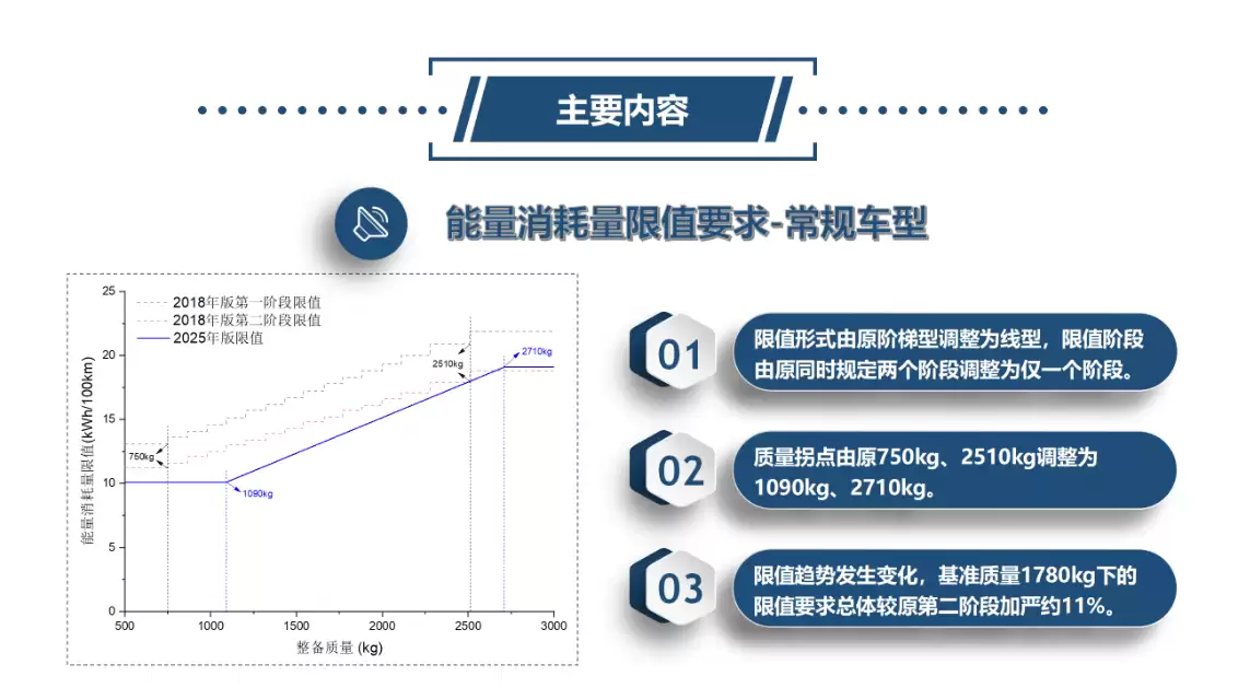 与上一版推荐性标准相比,新标准在限值要求上显著加严。以基准质量为1780公斤的车型为例,其电耗限值总体加严了约11%。同时,标准根据整车质量差异,制定了分阶段、差异化的限值体系,将原有的阶梯型限值形式优化为线性,并调整了质量分级标准。具体来说,纯电动乘用车的整车质量拐点由原来的750公斤和2510公斤调整至1090公斤和2710公斤,这使得电耗管控更为精准。