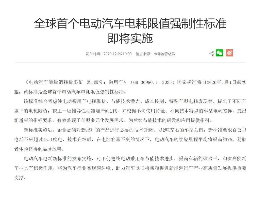 新标准的出台与头部企业的技术动向形成呼应,标志着我国电动汽车产业正式进入能效竞争的新阶段。通过建立强制性的电耗准入门槛,监管部门旨在推动行业建立“技术节能”与“管理节能”并重的发展模式,为全球电动汽车能效标准制定提供中国方案。随着2026年实施日期的临近,车企正加速研发新一代低能耗技术平台,预计将引发新一轮产品技术升级浪潮。