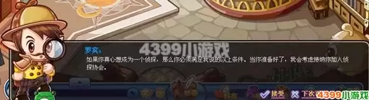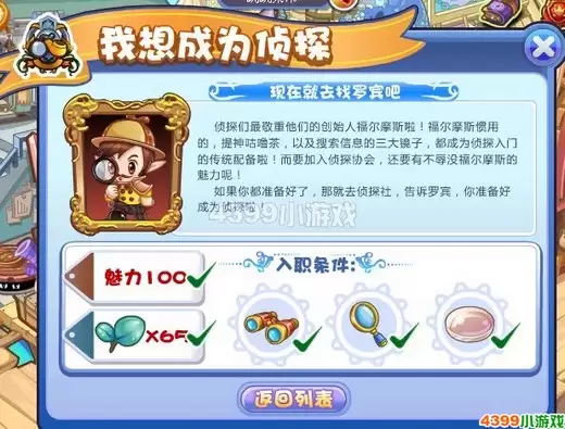 在洛克王国成为一名侦探需要满足以下条件:魅力值达到45,携带咕噜球16个,并准备好望远镜、放大镜和凸透镜。当角色的魅力属性达标后,前往彼得大道的福尔摩斯事务所,找到NPC“罗宾”并完成他指派的任务,即可正式加入侦探行列。