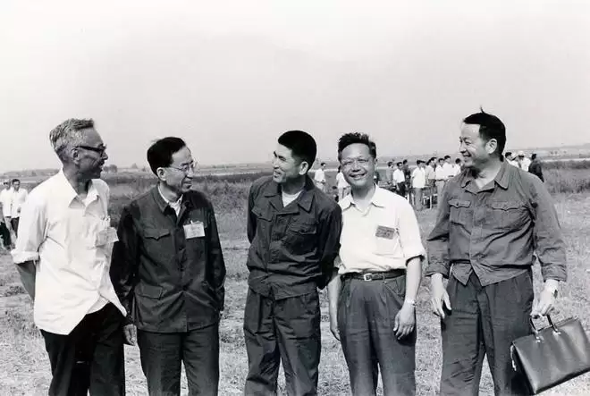 顾诵芬(右二)与试飞员曲学仁(中)、试飞指挥员王昂(右一)、现场总指挥管德(左一)等在歼-8Ⅱ试飞现场
