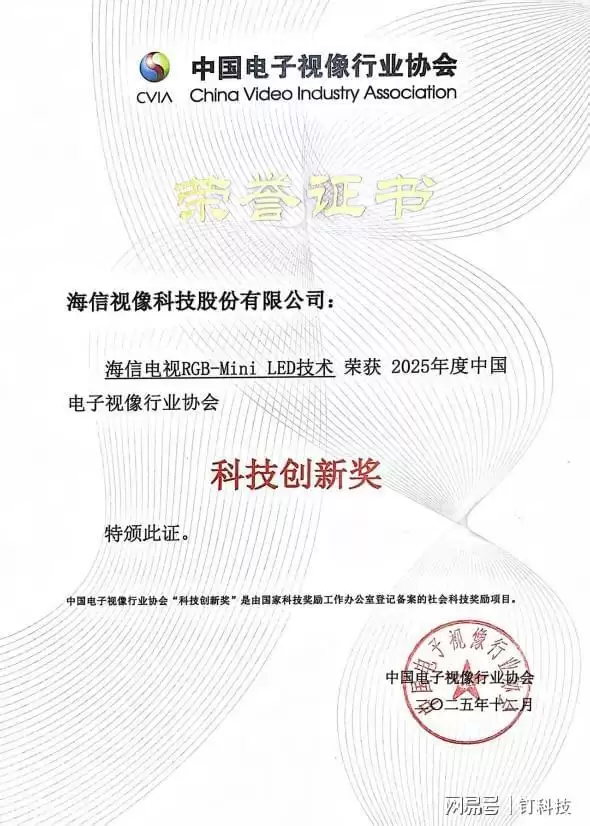 在不久前举办的2025中国音视频产业大会上,中国电子视像行业协会为海信电视RGB-Mini LED技术颁发了“科技创新奖”这一权威奖项,再次印证了这一技术的创新高度和产业价值。