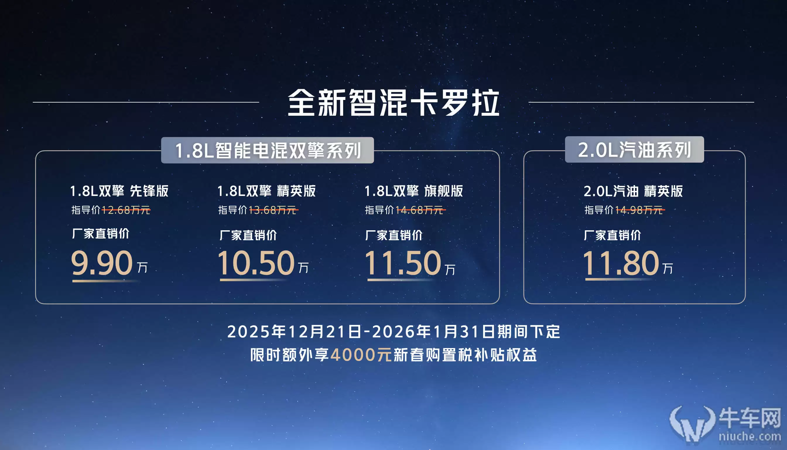 融合全球精工品质与中国新一代家用车智慧的全新智能混合动力卡罗拉,现已正式登陆中国市场。新车共推出4款不同配置车型,最新指导价区间为9.9万元至11.8万元。从即日起至1月31日,消费者下订更可额外享受4000元新春购车置换补贴,为您的家庭购车计划带来了更具吸引力的超值选择。