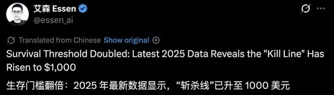 网友Essen曾发帖称,2025年「斩杀线」已被生活成本推高至1000美元。