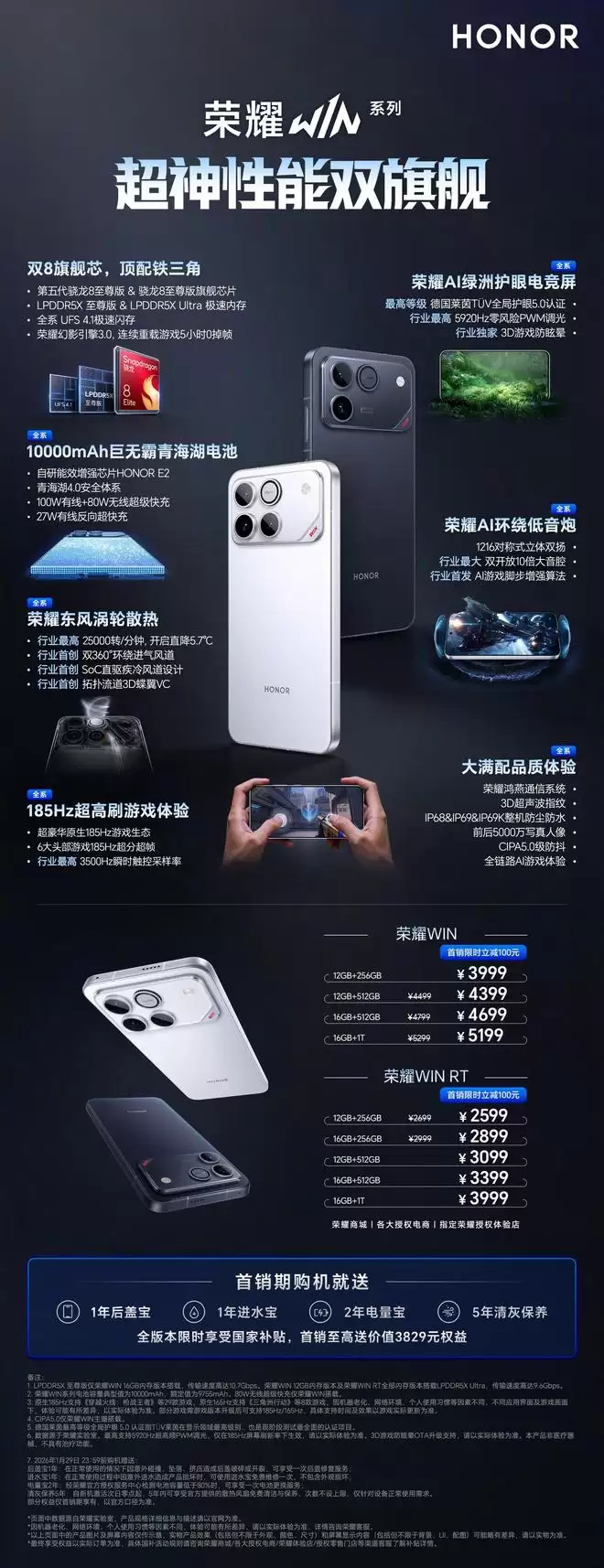 售价方面,荣耀 WIN RT 和荣耀 WIN 起售价分别为 2599 元和 3999 元(12GB + 256GB),最高可选 16GB + 1TB。