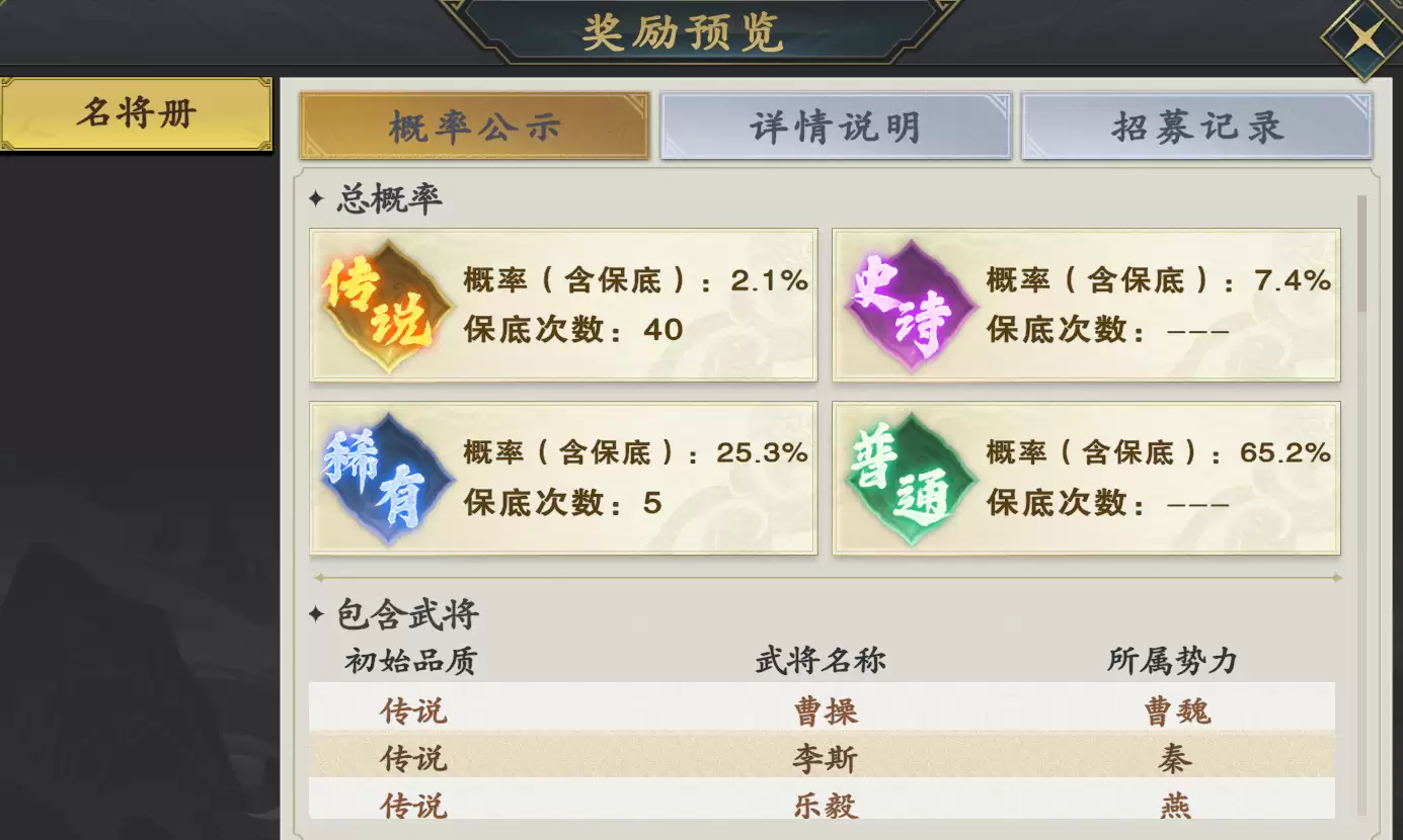“名将招募”是游戏中最核心的武将获取方式,也就是大家常说的抽卡。在武将卡池中,使用“名将册”即可进行抽取,卡池内的武将品阶各异。品阶越高的武将,抽取难度自然也越大,尤其是传说级别的武将,往往需要借助一些特殊的保底机制才有机会获得。至于“名将册”的来源,玩家可以通过参与各类活动获取,也可以直接在商城中购买。